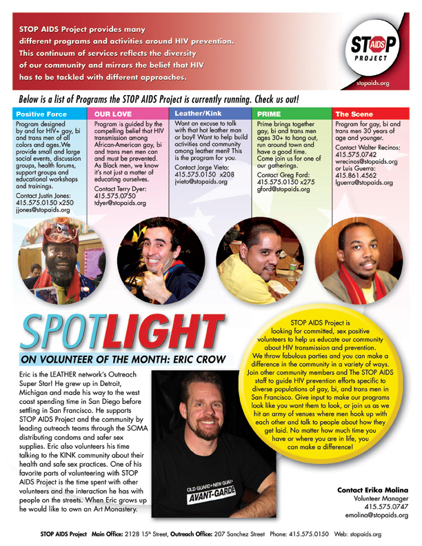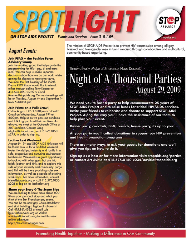 These newsletters were distributed throughout the community. Provided updates on projects and events STOP AIDS Project was offering as well as the kinds of programs STOP AIDS Project offers to the community.